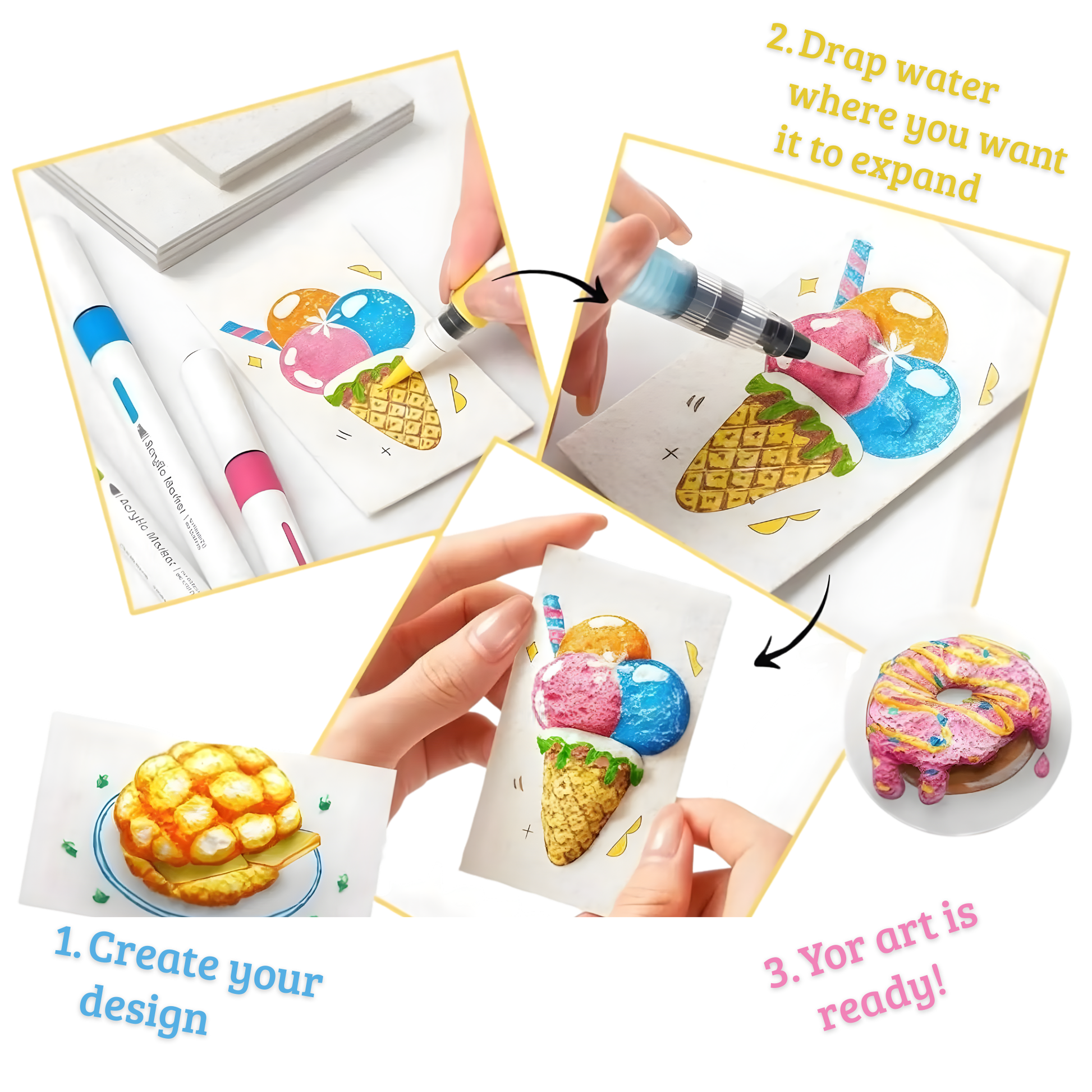 2. Activate with Water โ Gently brush with water to see your design expand into a 3D effect.
