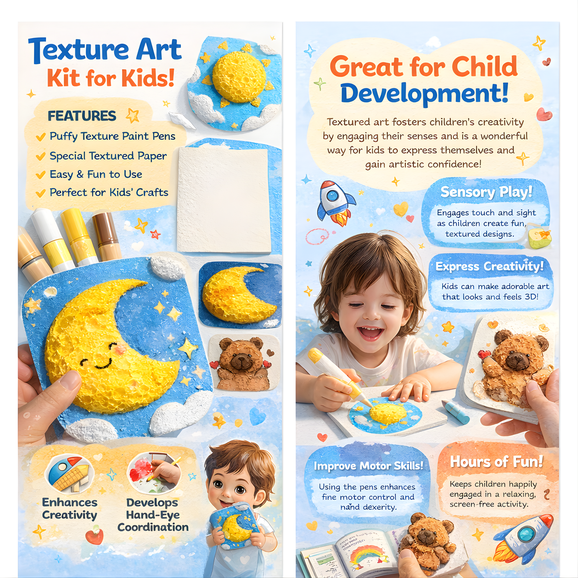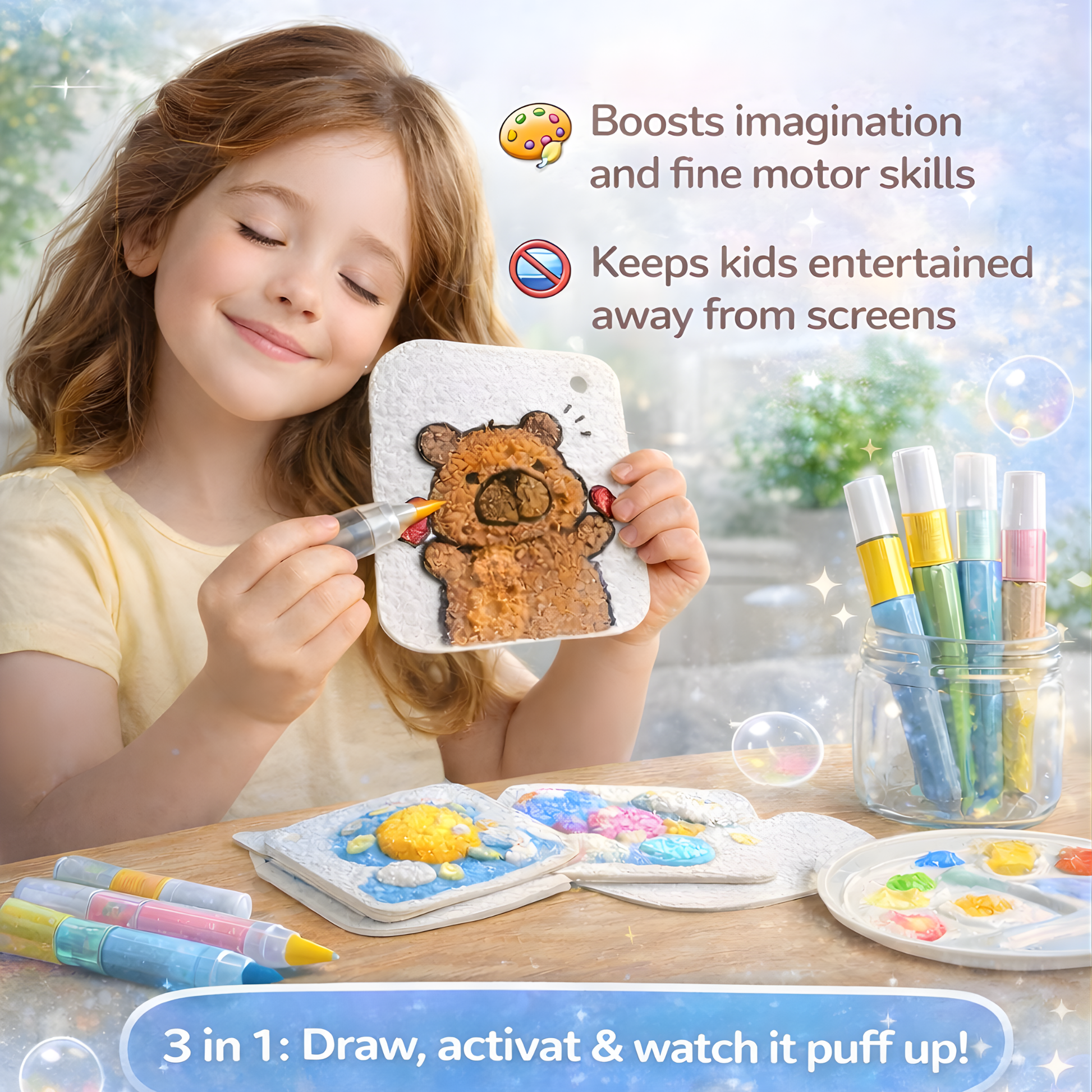 This creative set transforms ordinary drawings into amazing 3D textured artwork when water is applied. Perfect for stimulating children's imagination and creativity.